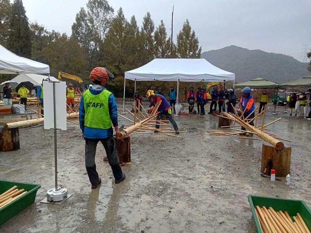 11月9日に岐阜県立森林文化アカデミーにて開催された岐阜県伐木安全技術評価会2025に参加しました。今回の評価会では丸太合わせ輪切り、伐倒(簡易方式)及び枝払いの3種目の競技が行われ、それらの合計得点により順位が決定されます。県内の各事業体から15名が選手として出場し、その内弊社山林事業部から5名が参加しました。当日は冷たい雨が降る中での競技となりましたが、全ての選手が真剣に技術を競い合う熱い戦いとなりました。また会場では審判を務める方々も含め、オレンジや赤や黄色といった視認性の良い服装が目立ち、昔の地味な林業のイメージから掛け離れた風景が広がっていました。