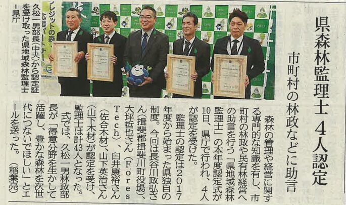 岐阜県では、地域における森林管理及び経営に必要な専門的知識を有し、市町村林務行政の支援や民有林経営への助言等を行う岐阜県独自の人材である「岐阜県地域森林監理士」の養成及び認定を実施しています。この度、本年度の認定式が県庁で行われ、弊社社員も認定を頂きました。 これからも社員のスキルアップをサポートし地域に貢献できる人材教育に力を入れてまいります。