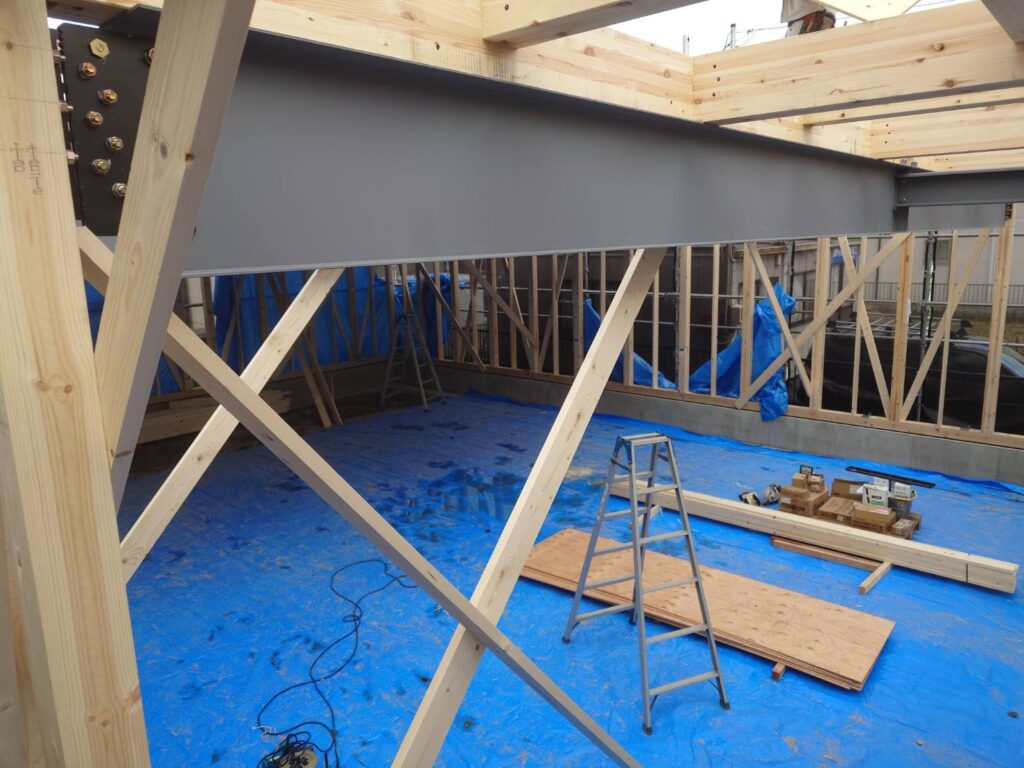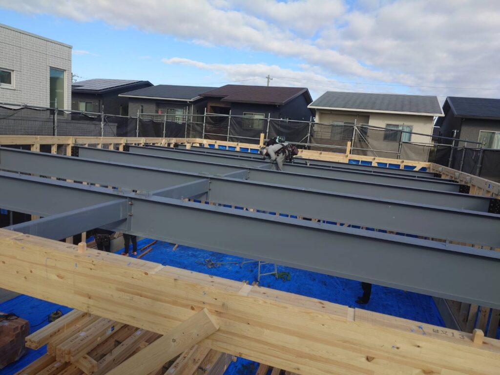 岐阜県では初めての採用事例になる物件でしたが、工務店様、大工様、鳶様のご協力のもと、無事に建て方を完了することができました。